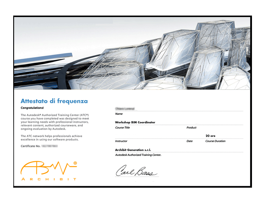 Attestato di frequenza al Corso Bim Coordinator rilasciato da Archibit Generation s.r.l.